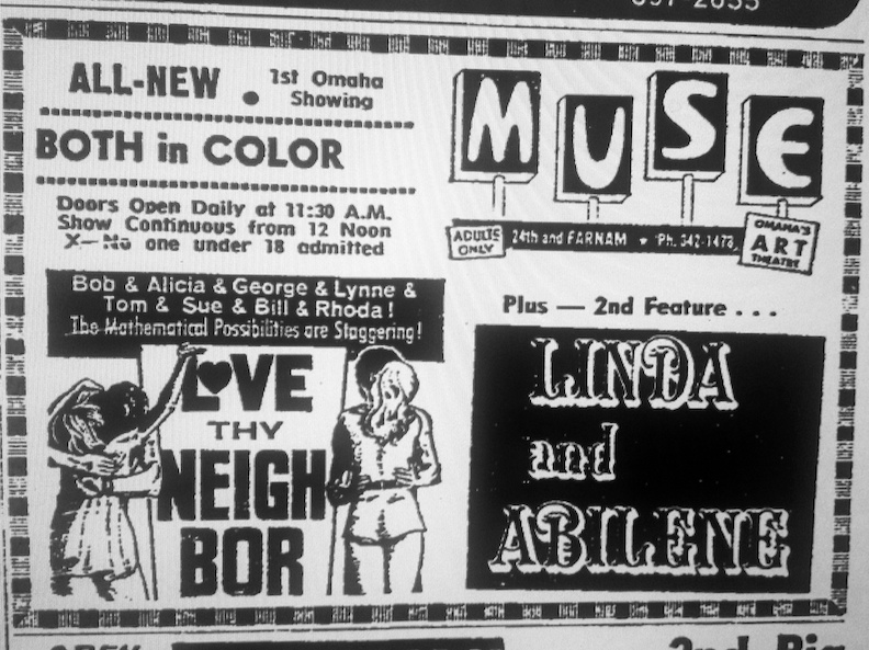From that point on I found a whole dossier of newspaper articles, one after the other, on the Muse Theater. It would appear from the countless articles that an obscenity task force had been formed, not unlike the vice squad of the bootleggers’ era. The Muse Theater maintained that they were showing “Stag Films” and art house pictures. According to a Michael Kelly article of March 15, 1972, Omaha City Prosecutor, Gary Bucchino, filed charges of “publication of obscene material” against long familiar offenders: the Art 16 Theater (2411 Leavenworth), the Muse Theater, the Ak-Sar-Ben Bookstore (1417 Douglas) and the Pussycat Theater (1314-16 Douglas). Kelly noted that the sheriff’s deputies ordered copies of “Antigone” and “Potpourri” from the Muse and “Classified Sex” and “The Sex Play” from the Art 16. Additionally seven books were purchased from the Ak-Sar-Ben Bookstore and about five from the Pussycat. Do you remember these colorful enterprises in our fine town?