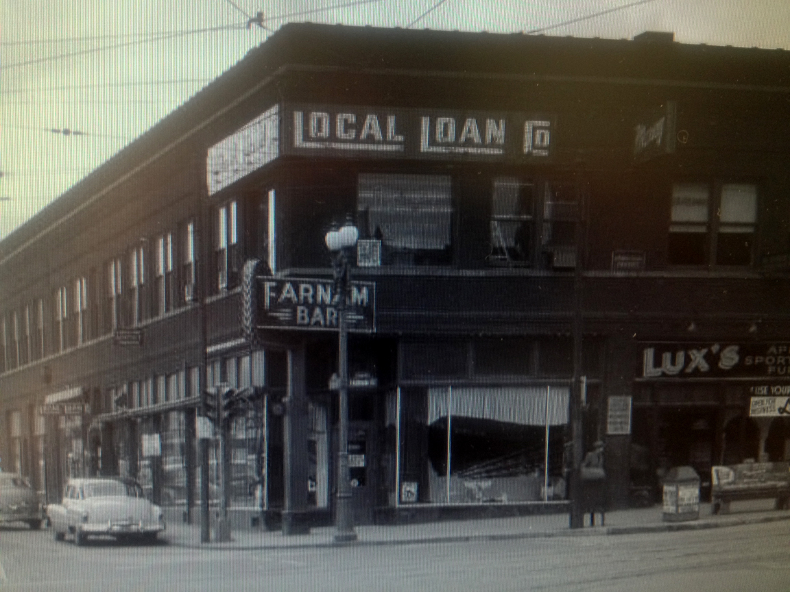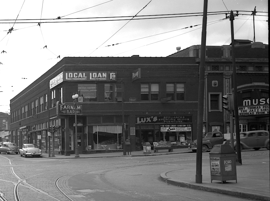 1953 detail. Notice the Farnam Bar now on the corner and Lux’s Appliance, Sporting Good and Furniture Store. The Local Loan Company is upstairs. Quite a different block.