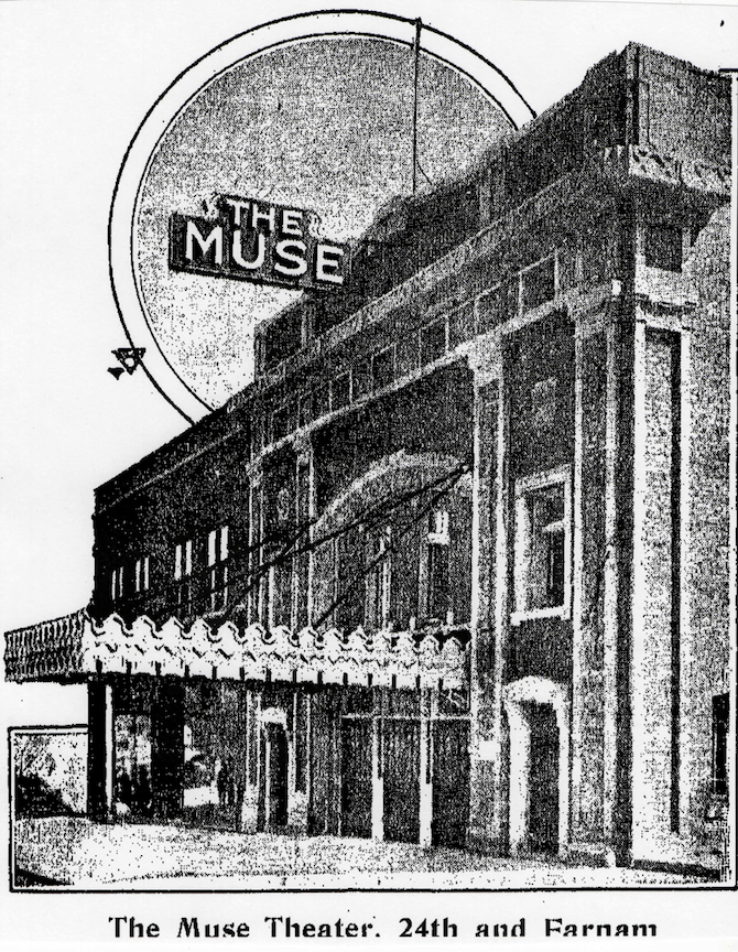 The Muse Theater was linked, early on, to two stories with a darker edge. In January 6, 1917, there was a highly publicized suicide of Edward L. Dodder, prominent Omaha undertaker and grand treasurer of the Nebraska Ancient Order of United Workmen. Doddler and his wife had apparently taken in a movie at the Muse Theater after he had attended a meeting of the Nebraska Workmen. Doddler then returned home to briefly say goodbye to his children and got his thirty-eight-caliber revolver. He left his watch, diamond ring, stud and all pocket money in a safe at his business and then drove “directly to his lonely trysting place with death,” seven miles north of Florence.