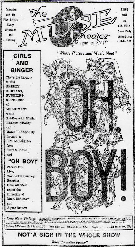 There was a bit of mystique hinted at when I stumbled across an article from August of 1919. New manager, Ballantyne, launched a new policy at the Muse Theater. “Better and fewer picture.” This pronouncement made known that the Muse “will buy only such pictures as are known to be of the higher class and each picture will be shown for a week.” This was the first theater house in Omaha to “adopt such a big-city policy.” I enjoyed the wording and sentiment. Class it up, Omaha. Meanwhile the article went on to expose that that week’s film, “Oh Boy” would feature “six attractive girls singing and dancing in and among the audience as well as upon a stage which has been specially constructed for the occasion.” Keep in mind, this was still considered entertainment for the whole family.