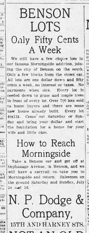 N. P. Dodge & Company initiated the sale of parcels in the Morningside Addition, of which 6148 Western Avenue is included, in the early 1900s.