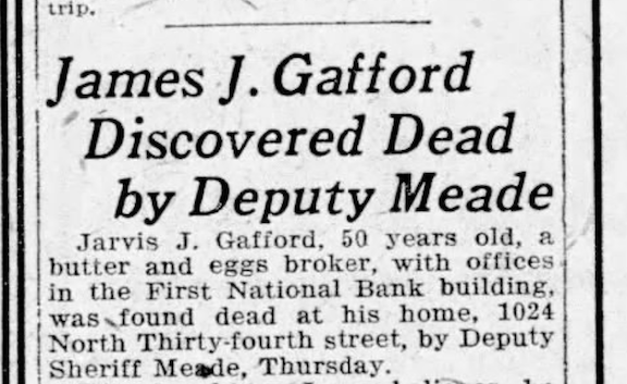 To complicate matters in March 1918, Evening World-Herald announced James J. Gafford, a butter and eggs broker, killed himself in the family home at 1024 North Thirty-fourth Street. Daughter June assumed he committed suicide, despondent because of the recent death of his wife, Mrs. Elizabeth “Lizzie” Gafford. The family maid, Mary Gerhardt, told Deputy Sheriff Meade that Mr. Gafford, age 50, was upstairs sleeping. When Meade entered the room, Gafford was dead with a bullet wound in his temple and a discharged revolver by his side. Children: Mrs. William Carbach; Frances, 11; June age 23. Jack, 9 and Jarvis 18. Lizzie Gafford, I would discover died at the age of 45 from unknown causes in March of 1918 at the hospital.