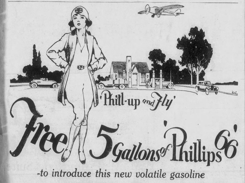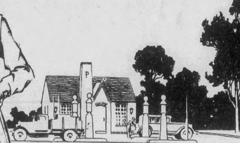 1930. Omaha World-Herald. The adorable Phillips 66 look from late 1920 through the 1930s. This gives us an idea of the original door and windows, sconces and high hopes for a “P” on that chimney.