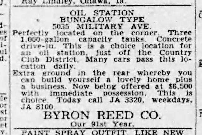 October of 1929. Omaha World-Herald. The first advertisement that I found for filling station at 5035 Military Avenue. This is a great example of what the antique gas pumps would have looked like out front–now paved over.