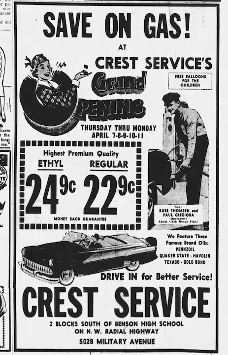 The rapid rentals and ownerships persisted. In 1955, Mr. Van W. Harman transferred ownership to Crest Service Inc. Oddly, the Rotella family operated the station under the City Service name. In 1957, Paul Cieciora managed the Crest Service Station. By 1958, Marion’s Frontier Service had assumed control of the keys. Crest Frontier Station, a prominent chain, had merged with Frontier, remaining at 5035 Military, then seemed to merged with Vickers. By the early 1960s Crest Vickers had hung their sign. The mid to late 1960s brought in Al’s TV and Record Shop, and B. K. Mower Repair. Various auto sale businesses rented throughout the 1970s.