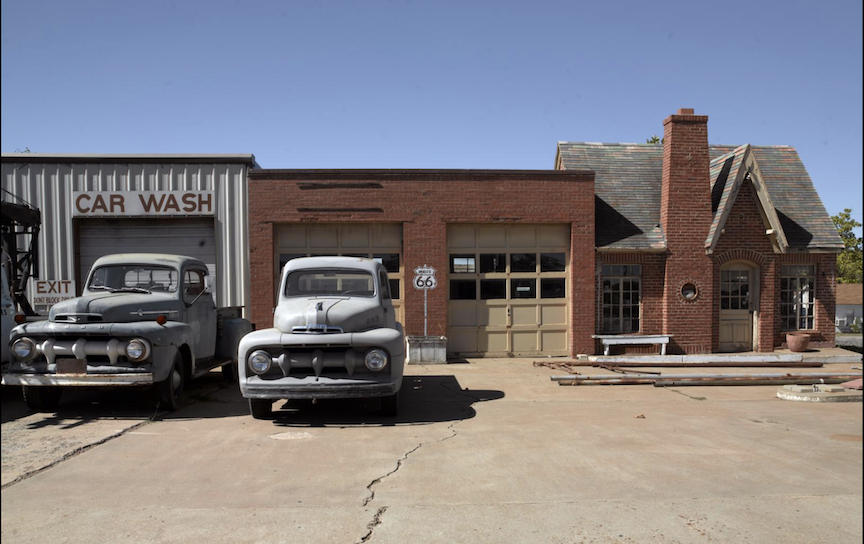 Vintage Phillips 66 Gas Station with expansion over time and historic cars. Route 66. Chandler, Oklahoma. Highsmith, Carol M., 1946-, photographer. This example shows us what the windows and door would have looked like. Also looks like the original tile roof.