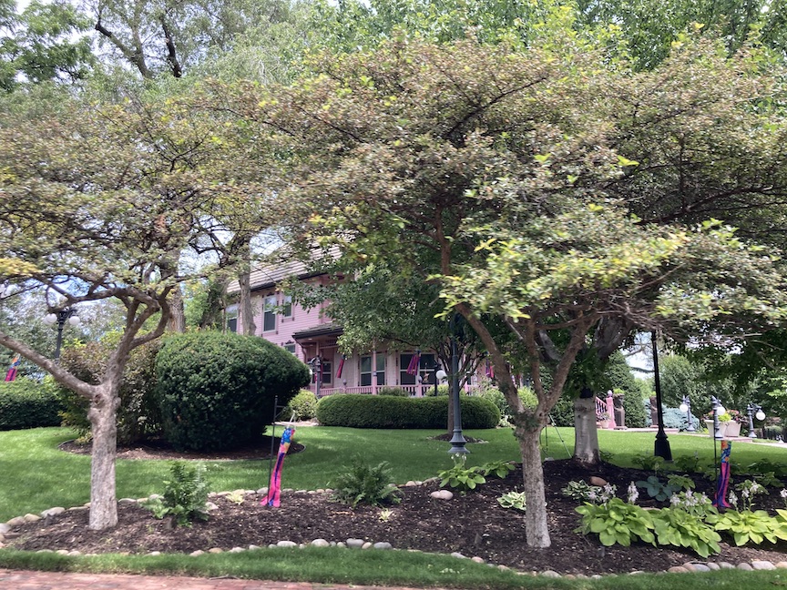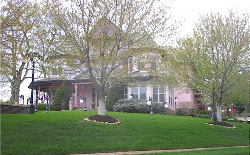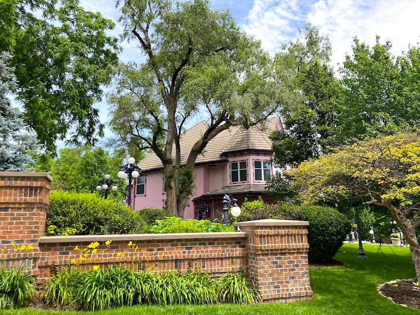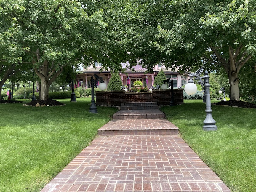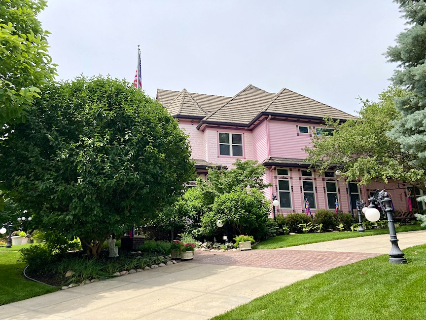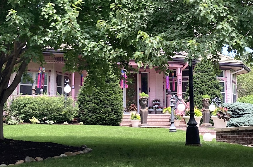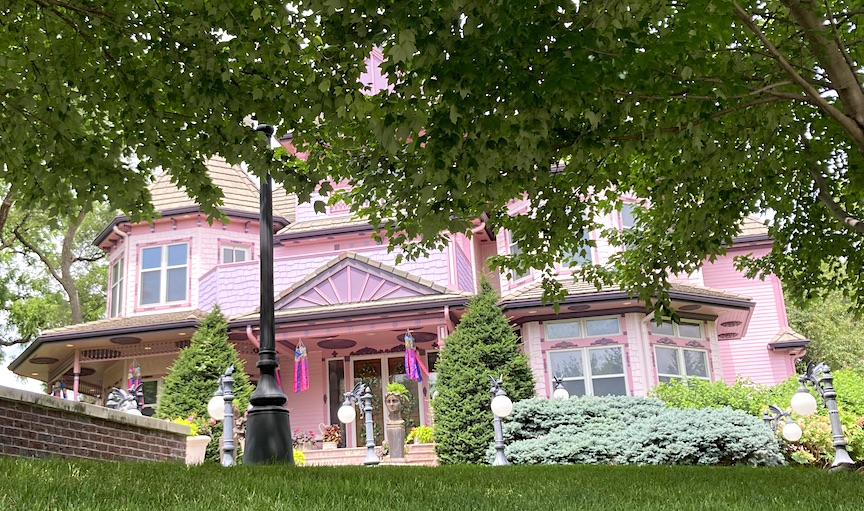 1412 North 143rd Avenue has 5,431 square feet, perhaps exceeding above ground measurements. It comprises four bedrooms and five bathrooms. The residence was initially a charming pale yellow and white, but between the 2016 and 2018 time period, it was repainted in pink with purple accents. While enthusiasts of Victorian architecture appreciate the application of these bright hues to accentuate her many intricate features, it is my perception, in the kindest terms, that some individuals contest the selections at 1412 North 143rdAvenue. The numerous vintage-style lamps featuring pink bulbs, along with the newer, diminutive gargoyle lamps, enhance the dream-like qualities. Artistic, free, fun—whimseys one might expect to see only in older parts of Omaha. Some may critique this property without comprehending the history of pink houses from yesteryear or simply wringing their hand over an HOA untethered; nonetheless, I have assumed the owners are adopting the Painted Lady aesthetic or that somebody is a cancer survivor seeking to celebrate or commemorate their journey.