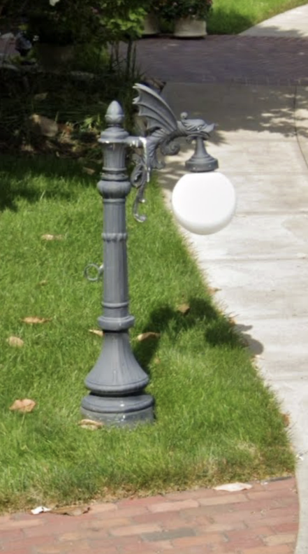 By 2016 the big globe lampposts and gargoyles arrive and are stationed throughout the property.